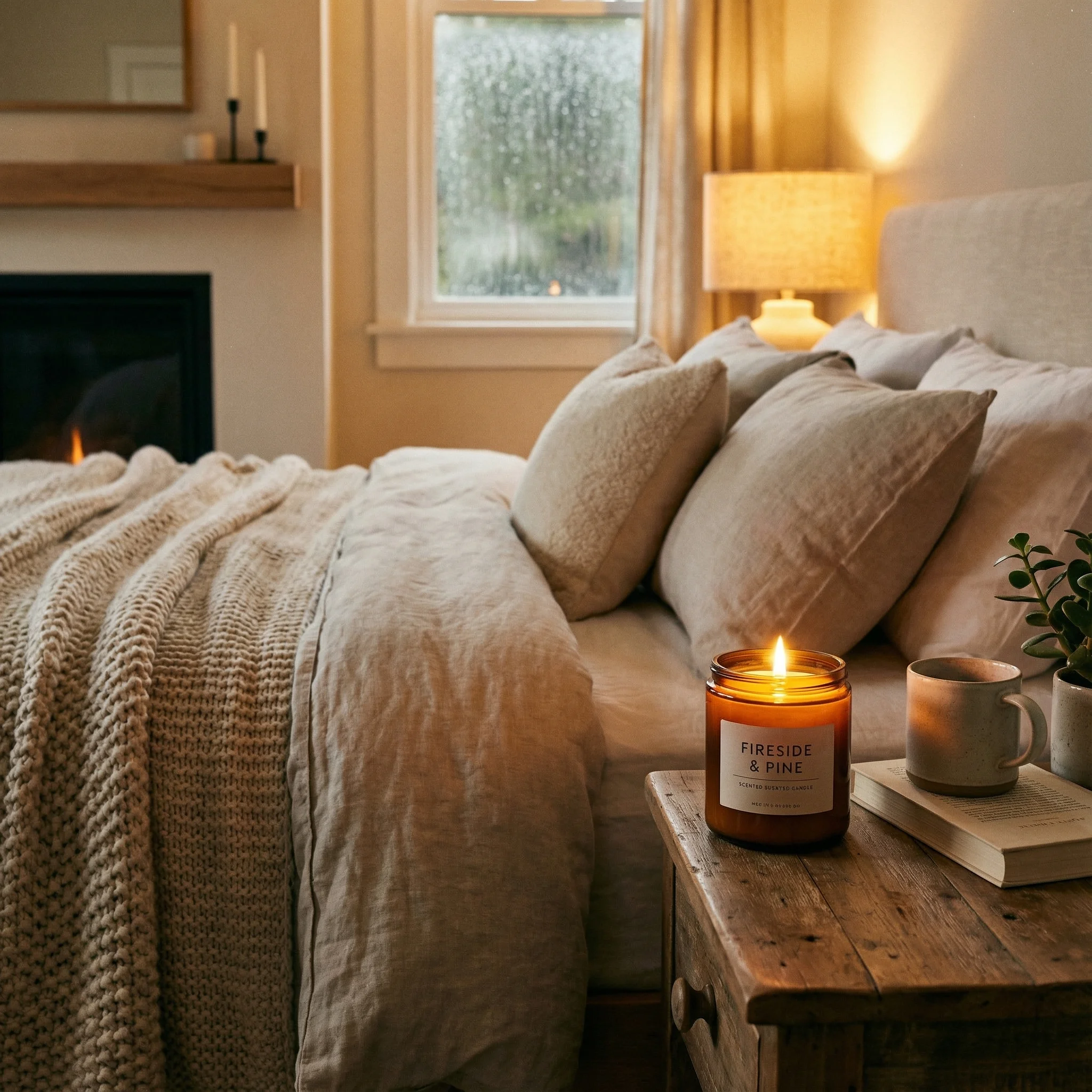 Profesjonalna grafika produktowa AI w ciepłej atmosferze sypialni. Zmiana tła na przytulne wnętrze z miękkim oświetleniem. Zdjęcie produktowe na Allegro i Amazon idealne dla pościeli, lampek, kosmetyków nocnych i relaksacyjnych - gotowe w sekundach bez fotografa.