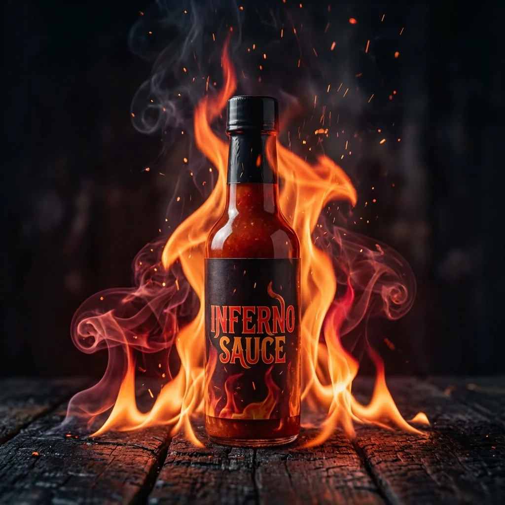 Profesjonalna grafika produktowa AI z realistycznymi płomieniami tańczącymi wokół produktu. Zmiana tła na dramatyczną scenę z ogniem na głębokim czarnym tle. Zdjęcie produktowe na Allegro i Amazon idealne dla ostrych sosów, akcesoriów sportowych, produktów "hot" - gotowe w sekundach bez studia.