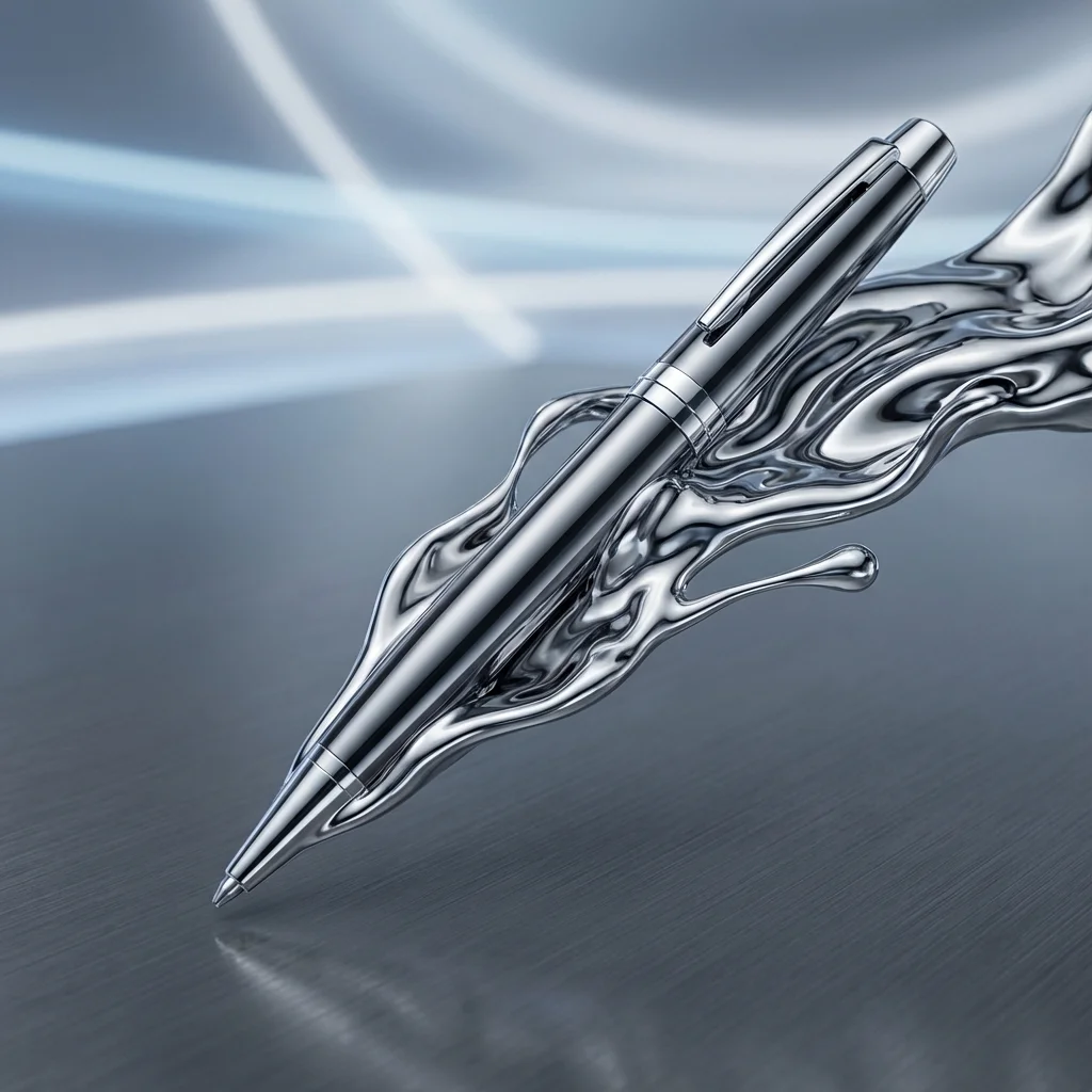 Płynny chromowy metal opływający produkt. Futurystyczna, high-tech estetyka z refleksami świetlnymi.