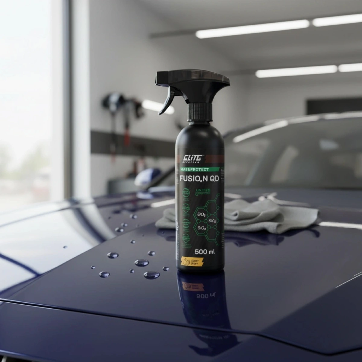 Produkt motoryzacyjny w naturalnym kontekście - na masce samochodu, w garażu lub przy detailingu. AI dopasowuje scenę do typu produktu. Idealne dla akcesoriów samochodowych i chemii auto.