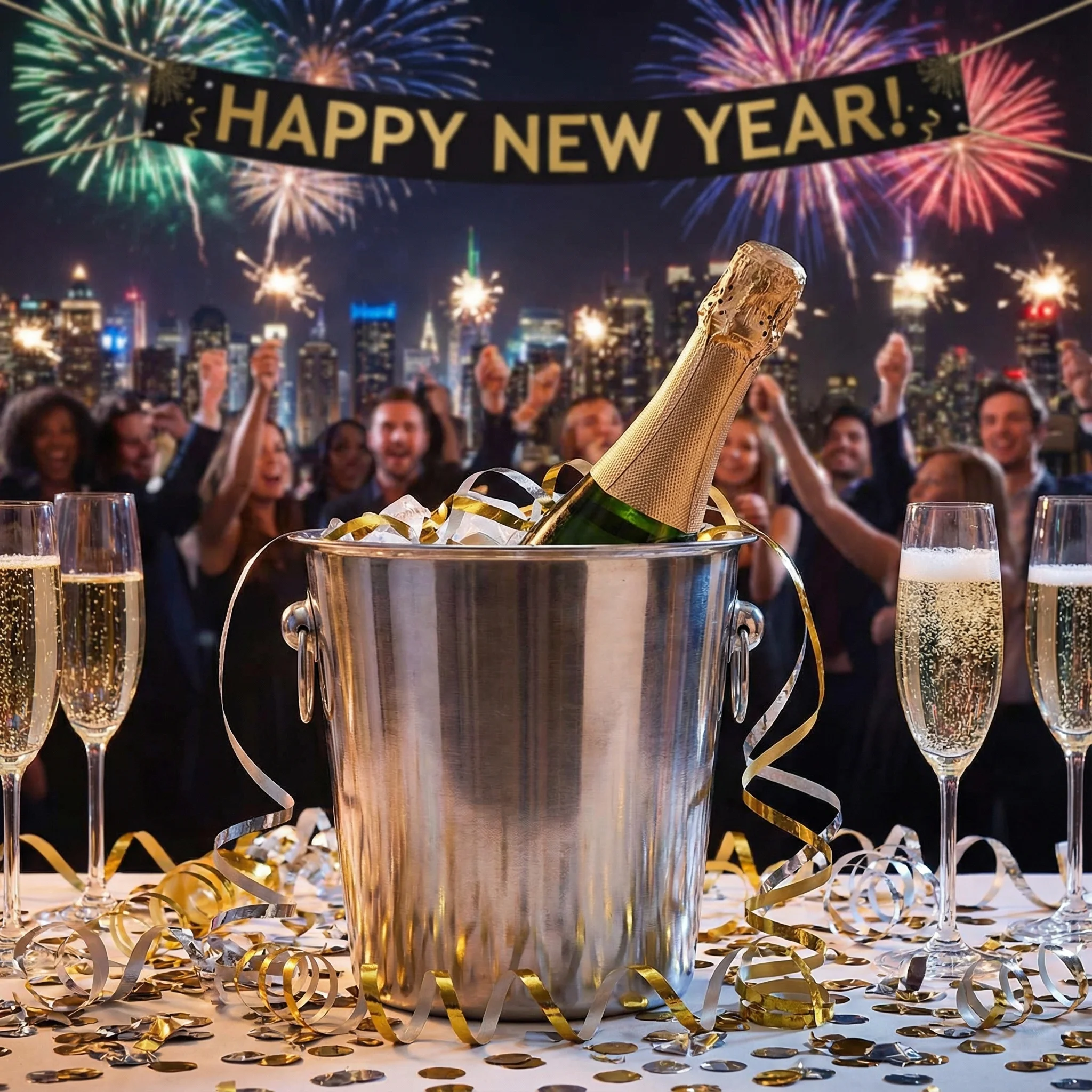 Noworoczna celebracja z szampanem i złotymi konfetti. Glamour w czerni i złocie - elegancka impreza sylwestrowa.