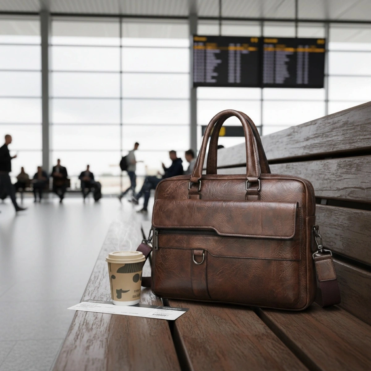 Produkt na skórzanej torbie podróżnej na ławce dworca lub lotniska. Bilet, kawa na wynos, rozmyte tło z pasażerami i tablicami odlotów. Klimat przygody i podróży dla marek lifestyle i travel.