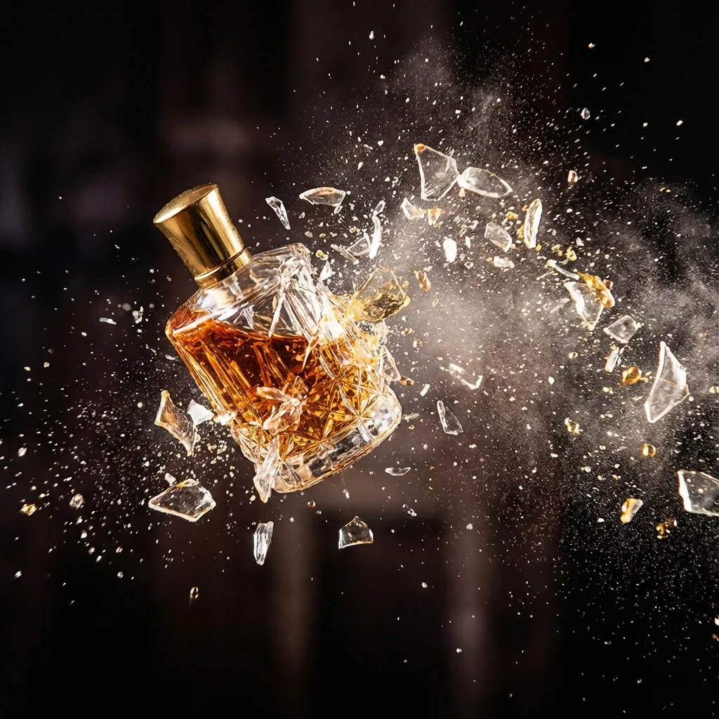 Profesjonalna grafika produktowa AI z efektem rozbicia na fragmenty. Zmiana tła na dynamiczną scenę z rozlatującymi się kawałkami. Kreatywne zdjęcie produktowe na Allegro i Amazon przyciągające uwagę - gotowe w sekundach bez fotografa.