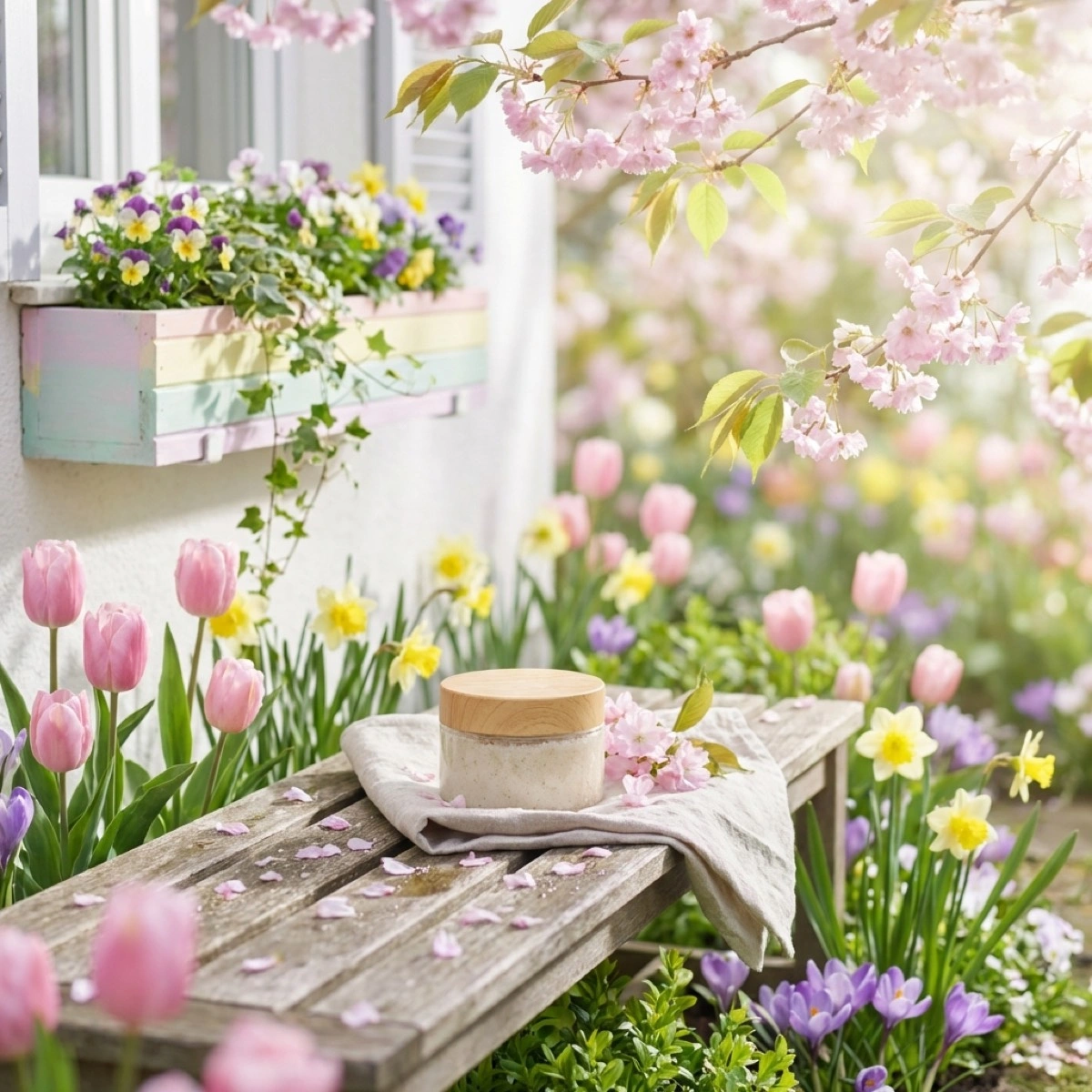 Świeży wiosenny ogród z kwitnącymi wiśniami, tulipanami i żonkilami. Idealne dla kosmetyków, wellness, produktów domowych i kampanii sezonowych. Pastelowe kolory i delikatne światło tworzą nastrój nowych początków i świeżości.